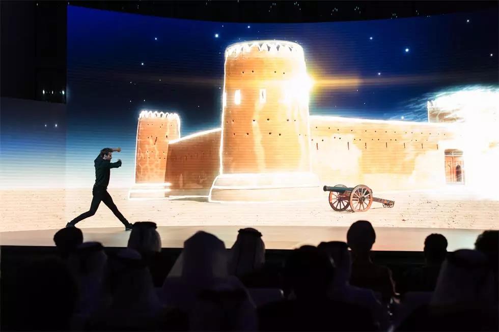 活動公司選擇了一個古老的符號作為這次活動的主題概念: “光是能量,光是通信,光是美,光是力,光是生命,光是知識”,將活動的主題演繹成一場完整的體驗(yàn)之旅。活動的入口處搭建了一條70米長的LED“地毯”,活動公司使用了在卡塔爾的12個標(biāo)志性地點(diǎn)拍攝的航拍照片作為地毯的視頻內(nèi)容,這條地毯帶著客人們踏上了穿越這個國家的旅程。并制作了一場多媒體燈光表演,講述了卡塔爾是如何成為一個以知識為引導(dǎo)的國家發(fā)展的故事。故事從講述第一批書籍被帶到卡塔爾,到新國家圖書館的開幕而結(jié)束。